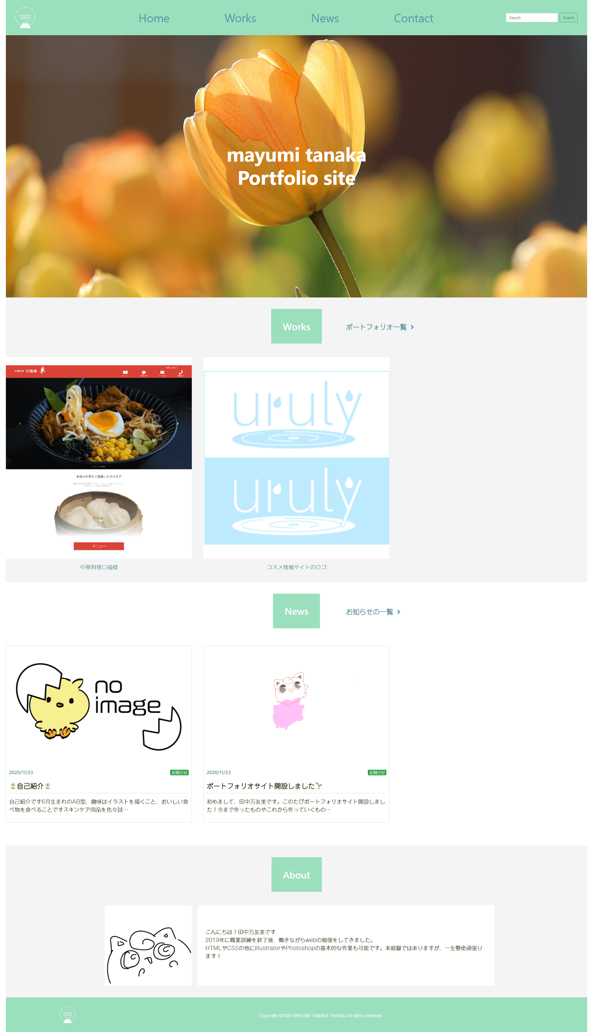 ポートフォリオ Home > ポートフォリオ > Web > Mayumi Tanaka Portfolio site プロジェクト名 Mayumi Tanaka Portfolio site URL http://green-ebino-2681.floppy.jp/Portfolio/ 制作時期 2020年 09月 使用ツール コメント 当ポートフォリオサイトになります。企画、デザイン、コーディングまでは自身で、CMS構築は知り合いにオリジナルテーマで制作していただきました。まだまだWordPressは手を付けるところまでいけなかったので、これからしっかり勉強しようと思っています。 中華料理口福楼 LP練習 題材シルクマスク back